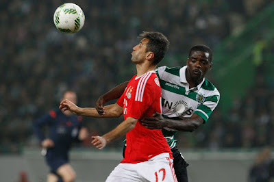 O jogo andou neste figurino durante a fase inicial, e achei mais uma vez que o primeiro golo seria determinante - na primeira volta o início de jogo também foi semelhante, e depois o nosso adversário marcou na primeira ocasião que teve e foi o que se viu. Mas durante esta fase do jogo o Benfica era a equipa mais perigosa e estava por cima no jogo, conseguindo ignorar e até controlar a euforia quase incontida com que os adeptos da casa encaravam este jogo, e por isso não me surpreendeu que fôssemos nós a conseguir esse importante primeiro golo, com vinte minutos decorridos. O lance começa no Jonas, que sobre a esquerda centra largo para o Pizzi. A defesa do Sporting consegue aliviar para a entrada da área, onde o Samaris tenta o remate de primeira. A bola bate no William e sobra para o Mitroglou, que se voltou mais rápido (enquanto o William foi para o chão) e na cara do Patrício fez aquilo que um matador sabe fazer. Um a zero para o Benfica. Pouco depois o Jesus fez uma alteração táctica, passando o Ruiz, que até então estava a jogar como segundo avançado, para a esquerda, o Bruno César para a direita, e colocando o João Mário mais no meio como apoio ao avançado. Com isto o Sporting começou a ter mais frequentemente superioridade numérica no meio campo, até porque hoje o Pizzi esteve muito mais preso à faixa direita, já que tinha que ter em atenção as subidas do Jefferson. O Sporting passou a ter mais bola e a jogar mais tempo no nosso meio campo, mas felizmente quase sempre sem conseguir criar grandes ocasiões de perigo frente a uma equipa quase sempre muito certinha a defender, que conseguia manter as linhas muito juntas e dar pouco ou nenhum espaço para o Sporting jogar entre a defesa e a linha média, e onde o miúdo Lindelöf chegava e sobrava para o melhor avançado do mundo e arredores que os malvados benfiquistas tentaram à viva força arredar deste jogo. A excepção a esta quase constante tranquilidade (e que excepção) surgiu a cinco minutos do intervalo, quando o Gaitán ficou a ver o Bruno César progredir à vontade pela direita e fazer um passe atrasado para a entrada da área, onde a bola acabou por sobrar para o Jefferson que atirou com estrondo à barra.