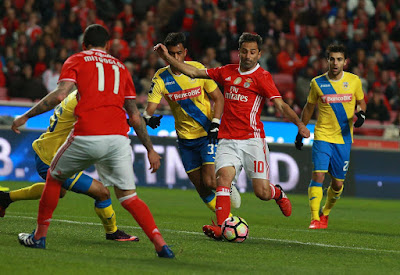 O Carrillo, conforme disse, fez seguramente o seu melhor jogo no Benfica. Não vou ao ponto de o considerar o melhor em campo, mas esteve num nível bastante bom e que justifica novas oportunidades. Acima de tudo interessa salientar a melhoria da atitude competitiva, parecendo muito menos alheado do jogo do que noutras ocasiões. O Mitroglou muito provavelmente hoje, não fosse a expulsão do Ederson, teria marcado mais do que dois golos. Parecia estar em dia sim, já que nas três ocasiões de que dispôs, marcou. O Nélson Semedo fez também um grande jogo, e neste momento parece estar fisicamente melhor do que já aparentou num passado não muito distante. Ajudou também ter à sua frente o Zivkovic, um jogador que não me canso de elogiar. Consegue quase sempre sair a jogar, ou entregar a bola bem redondinha nos pés de um colega. Grande capacidade técnica, enorme atitude competitiva, e cabeça fria para ser um autêntico saco de pancada para os jogadores do Arouca e continuar sempre a levantar-se e a voltar ao jogo. Bom jogo dos nossos centrais, e se o Luisão tem marcado aquele golo, a juntar ao pormenor técnico que exibiu com o jogo a acabar, acho que tinha saído em ombros. O Fejsa foi aquilo do costume, e até quando comete um ou outro erro no passe acabamos por desculpá-lo porque ele parte imediatamente para cima do adversário e insiste até recuperar a bola que acabou de perder. Jonas sempre importante, até sair exausto. E repito o que já disse: em boa hora regressou o Eliseu.